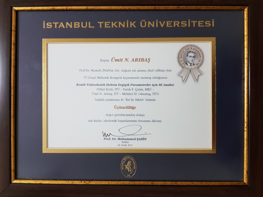 – “Finite Element Analysis of Viscoelastic Conical Helices for Various Parameters” proceeding in 17. National Mechanics Congress awarded third prize in the field of “Best Proceedings”, ITU (2011).